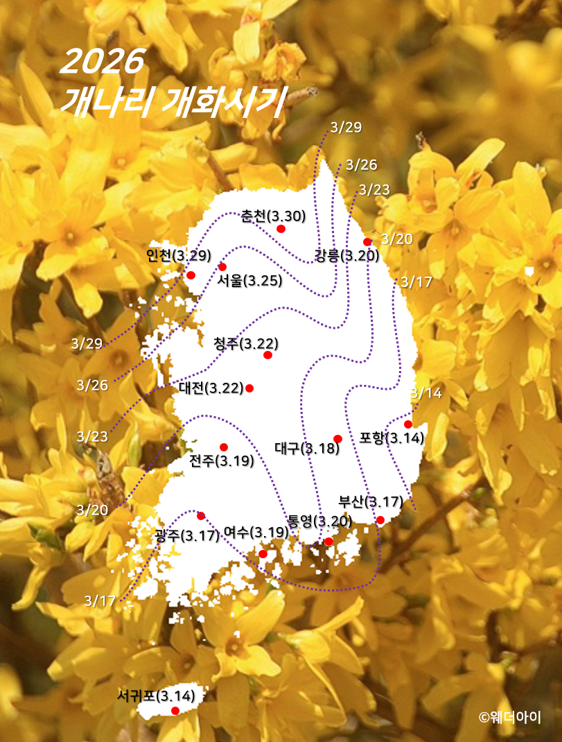 개나리는 서귀포에서 3월 14일, 서울에서 3월 25일 개화 예상